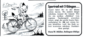 Hallo, hallo! (Buchtipps "Waldzirkus Kastorelli" und "Das Bergabenteuer der Tschullererbuben"); Seifenblasen (Anleitungen für Experimente) S.2 Werbung: Sportrad mit 5 Gängen, Hans.W.Müller, Solingen (FF-Zeichnung) S.2 Unsere Zeichenstunde S.23