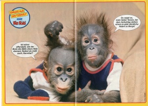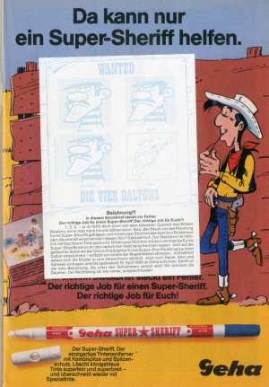 Aufkleber: "Ich bin der schönste Geier im Land" (Transparent-Sticker) Poster: Affenbabys (Orang-Utans) Werbebeilage: Postkarte Geha-Preisausschreiben (Dalton-Steckbrief) Seite 13